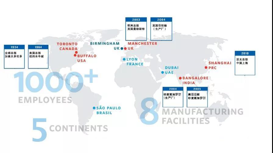 全球5大洲,5个大区总部,8个生产工厂,超过2000名员工。