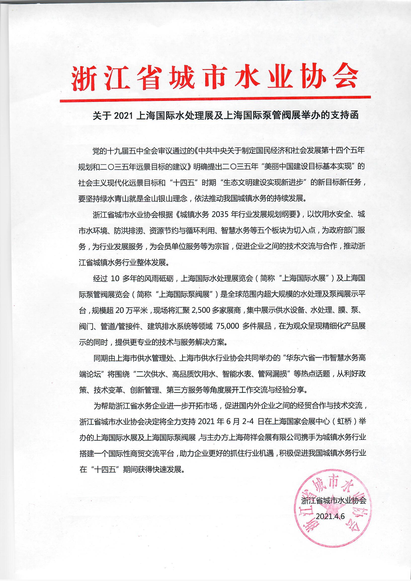 为帮助浙江省水务企业进一步开拓市场,促进国内外企业之间的经贸合作与技术交流,浙江省城市水业协会决定将全力支持 2021 年 6 月 2-4 日在上海国家会展中心(虹桥)举办的上海国际水展及上海国际泵阀展,与主办方上海尊龙凯时人生就是博会展有限公司携手为城镇水务行业搭建一个国际性商贸交流平台,助力企业更好的抓住行业机遇,积极促进我国城镇水务行业在"十四五"期间获得快速发展。