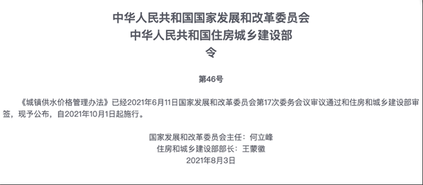 经过一年多的期盼,就在刚刚,国家发改委通过其官网正式对外公布新修订的《城镇供水价格管理办法》