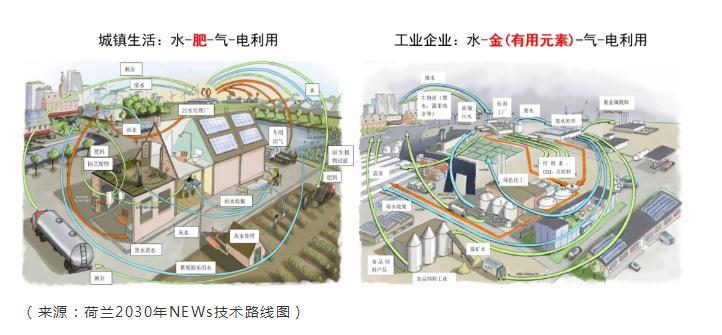 纵观国际,诸如美国、加拿大、丹麦、英国、荷兰、新加坡、德国、日本等发达国家,都是水处理行业创新比较活跃的代表,在碳中和体系下,这些国家围绕相关的规划、技术布局与创新、未来发展导向等做了大量工作。可以看出,很多典型的污水厂已经在向新生水源厂、有机肥厂、能源输出工厂转变。以荷兰为例,其针对城镇生活和工业废水,建立了面向未来的污水处理资源/能源利用模式。