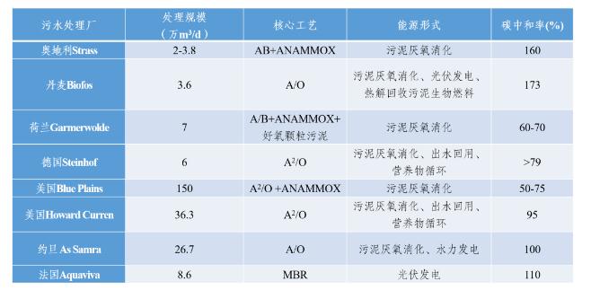 以下是国外相关污水处理厂通过能源利用或相关技术革新实现碳中和的代表案例。可看出,一些污水处理厂已实现100%能量自给,达到碳中和。