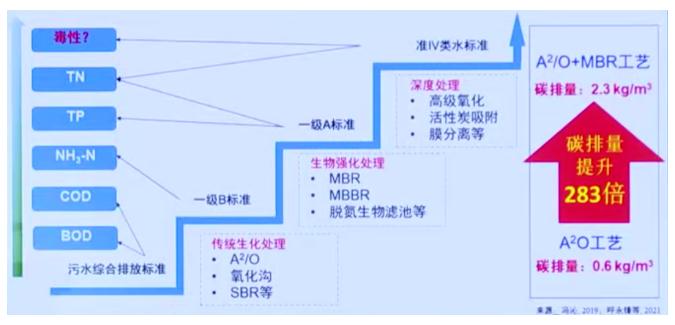 我国污水处理出水水质标准不断提高,传统工艺在实现达标排放的同时,往往带来了更高的碳排放量,所以要实现低碳、零碳甚至负碳处理,需要对处理工艺进行重新梳理、评估和变革。