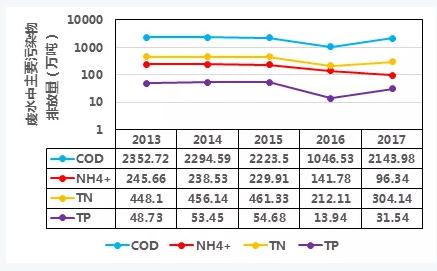根据2013-2017年《中国统计年鉴》,我国废水排放总量保持在700亿吨,其中废水中cod、氨氮(nh4+)、总氮(tn)、tp排放量如下图,可见2015年国务院发布了《水污染防治行动计划》(简称“水十条”)后,这几种污染物排放量得到了削减。