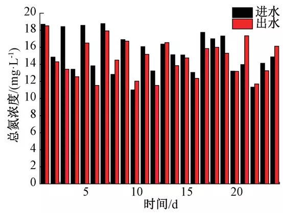 再生水厂以3.75万m3/d规模生物池为研究对象,控制该生物池污泥浓度为6 500 mg/l、水温23 ℃、混合液回流比为500%、生物池好氧区前、中、后段do分别为1.5 mg/l、1.2 mg/l以及0.5 mg/l。对好氧段进出水的总氮浓度变化进行检测,结果如图1所示。