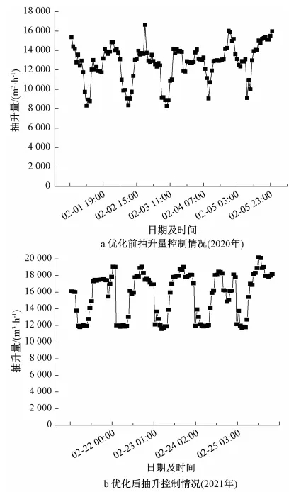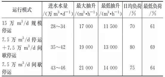再生水厂结合来水时变化及日变化规律,通过生物池及膜池间歇停运的方式(见表4),提高日水力负荷至70%以上。并充分利用上游污水管网调蓄功能,控制瞬时最低抽升量不低于运行曝气池负荷的60%(见图3b)。