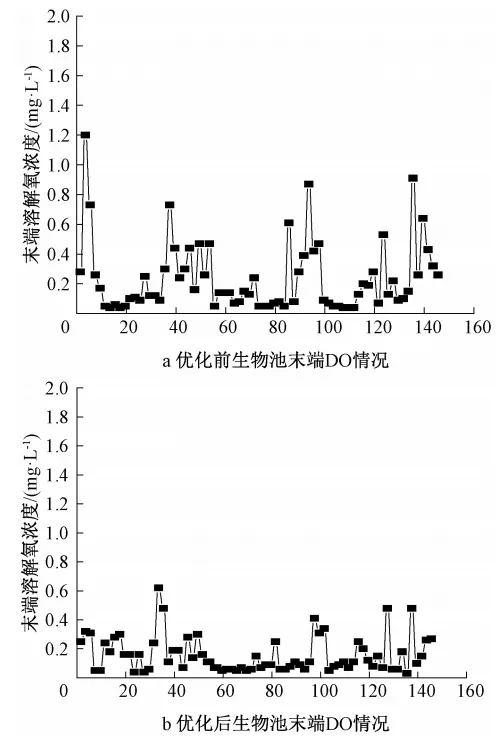 通过配水优化、抽升控制、生物池倒运等方式,稳定生物池水力负荷。优化后,生物池do稳定性明显提高(见图6b),末端do浓度基本低于0.5 mg/l,满足反硝化对于do浓度的要求,同时大大降低了回流液中的do对于进水碳源的浪费。