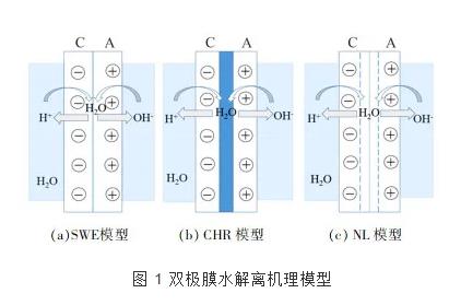 swe模型认为,在电场作用下,双极膜中间层(阴阳离子尖锐结合区)会因离子迁移而出现薄的无离子区域,认为水解离发生于此。h2o的解离跟弱电解质在高压条件下的解离过程相同,h+和oh-的产生速率为h2o的解离速率,解离常数与电压成正相关;