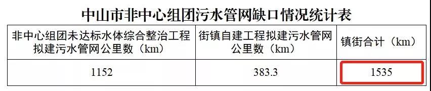 ▼截至2021年8月,中山市非中心组团污水管网缺口达到1535公里