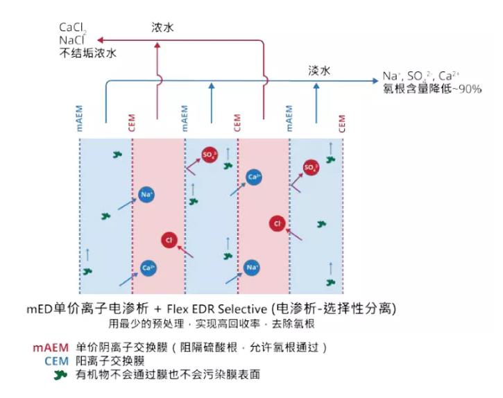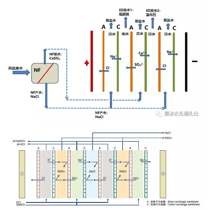nf-ed的联用工艺可以算一个思路,工艺可行性没有问题,它其实是置换电渗析(第二张图)的延伸应用。这种工艺在废水处理需求中落地性会受限于多种因素,如废水组成、浓水溶液的纯度、脱盐水的处理等。