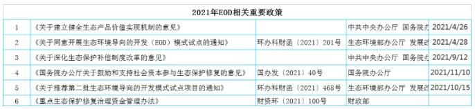 2021年,从政策层面的进一步明确到试点推进的不断加深,eod模式落地加速。根据环境商会观察,一是2021年全年,相关政策陆续发布,对eod的支持力度加大。