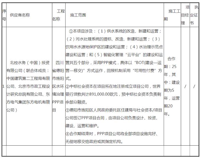 3月11日,四川省德阳市旌阳区水环境治理ppp项目采购结果确认谈判公示发布,中标人为北控水务(中国)投资有限公司(联合体成员:中国建筑第二工程局有限公司、北京市市政工程设计研究总院有限公司、东方电气集团东方电机有限公司)联合体,中标价为15590.26608万元。