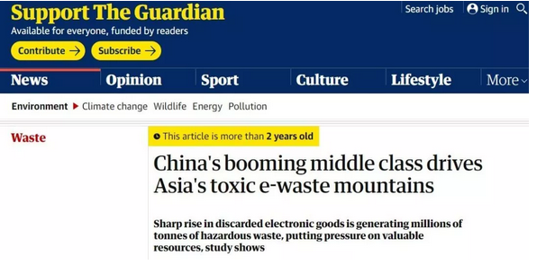 早在2年前,英国《卫报》曾刊登了一篇标题为“中国兴盛的中产阶级正在导致亚洲的有害电子垃圾堆积如山”的文章,称中国是导致亚洲有害电子垃圾快速增长的主要因素。还宣称,由于电子设备的生产本身就会对环境资源有很大的消耗,所以回收这些电子垃圾非常重要。但由于缺乏有效的环境管理政策,缺乏对电子材料的回收,电子垃圾所带来的问题变得越来越严峻。